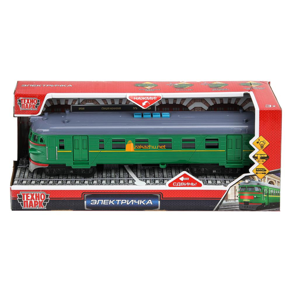 392855 Модель пластик свет-звук ЭЛЕКТРИЧКА 30 см, 4 кнопки, инерц, зелен, кор. Технопарк в кор.