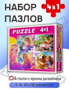 П-7589 ПАЗЛЫ 4 в 1. ПРИНЦЕССЫ С ЛЮБИМЫМИ ЖИВОТНЫМИ (9,16, 25, 36 эл.